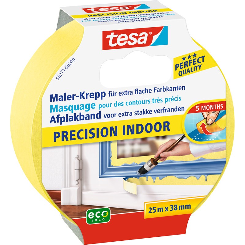 TESA® Malerband Precision Indoor speziell für Malerarbeiten im Innenbereich, extra dünn, reissfest, für flache und präzise Farbkanten, klebt sicher auf glatten Oberflächen, rückstandsfrei entfernbar bis zu 5 Monaten, für alle Farbtypen geeignet, lösungsmittelfrei und mehrheitlich aus nachwachsenden Rohstoffen.