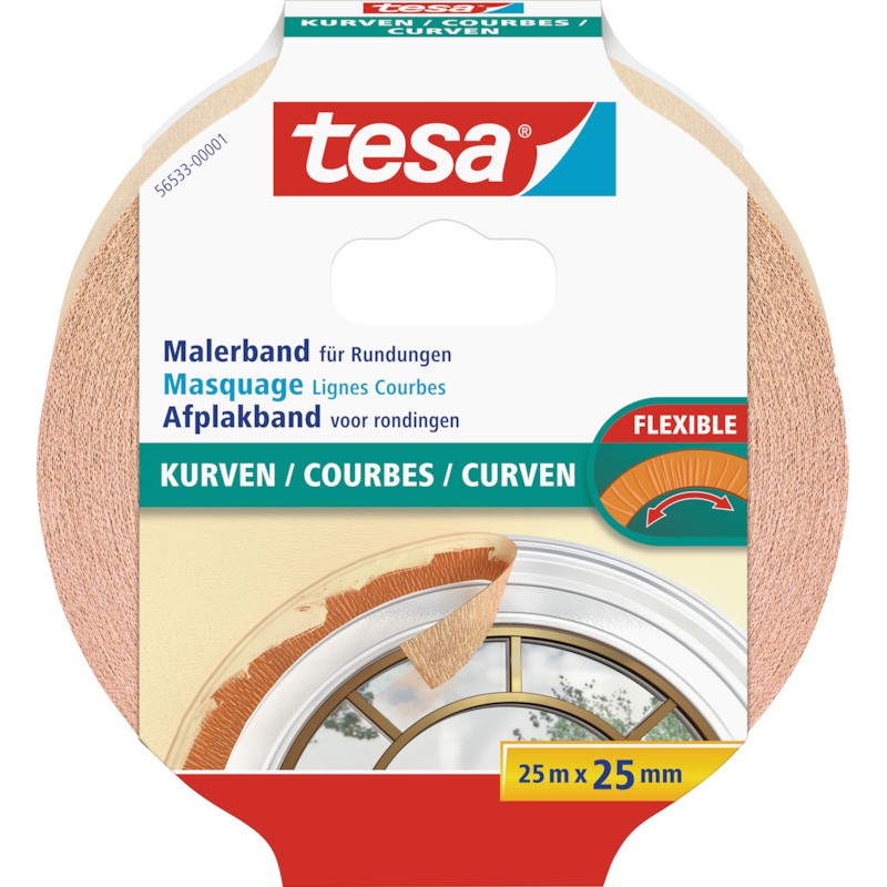 TESA® Malerband Kurven speziell für Malerarbeiten im Innenbereich, stark gekreppt, flexibel zum exakten Abkleben von Kurven und Rundungen auf glatten und rauen Untergründen, stark dehnbar für enge Kurvenverklebungen, rückstandsfrei entfernbar bis zu 7 Tagen, hoher Klebmasseauftrag, für alle Farbtypen geeignet.