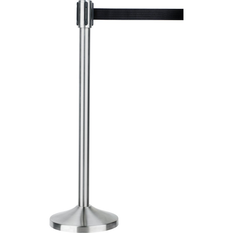 ALCO Absperrpfosten aus gebürstetem Edelstahl, Gurt aus Nylon 300 cm, automatische, mechanische Gurtaufwicklung, 4 Befestigungspunkte für den Gurt. Masse: Sockel Ø 32 cm, Säule H 100 cm. Gewicht: 12,5 kg.