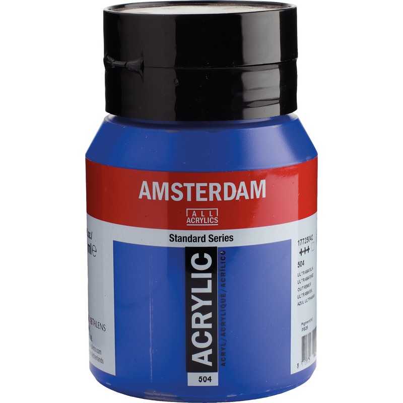 AMSTERDAM Acrylic Standard lichtecht, mit Wasser verdünnbar, nahezu geruchlos, aussergewöhnlich haltbarer Farbfilm (Bindemittel aus 100% Acrylharz) für ein unvergängliches Resultat, alkalibeständig und daher besonders auch für Wandmalereien geeignet. Flasche zu 500 ml
