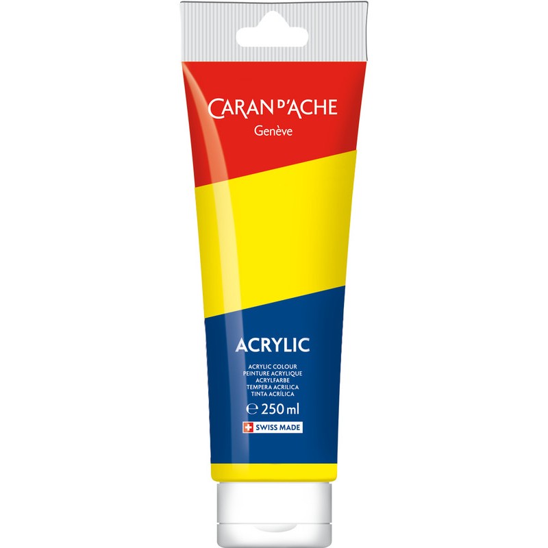 CARAN D'ACHE Acrylic leuchtende Acrylfarben, bilden keine Risse, werden nicht matt, lichtecht, mit Wasser verdünnbar, hohe Pigmentkonzentration, geeignet für glatte und strukturierte Oberflächen wie Leinwand, Gewebe, Stoff, Papier, Karton, Glas, Kunststoff, Metall, Holz etc., kann mit Pinsel oder Spachtel aufgetragen werden. Tube zu 250 ml.