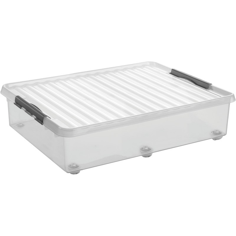 HELIT Aufbewahrungsbox the q-line mit Rollen aus transparentem PP, Deckel mit Clip verschliessbar, stapelbar, mit Rollen. Nachhaltigkeit eco:plus: verlängertes Produktleben, recyclingfähig, Recycelgehalt Abfall nach Gebrauch max. 100%, Abfallminderung.