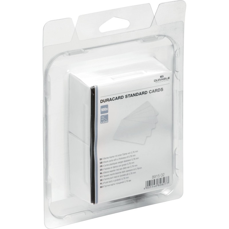 DURABLE PVC-Karten Duracard zur Bedruckung mit DURABLE Duracard ID 300, Format 53,98 x 85,6 mm. Packung zu 100 Karten. Nachhaltigkeit eco:plus: recyclingfähig.