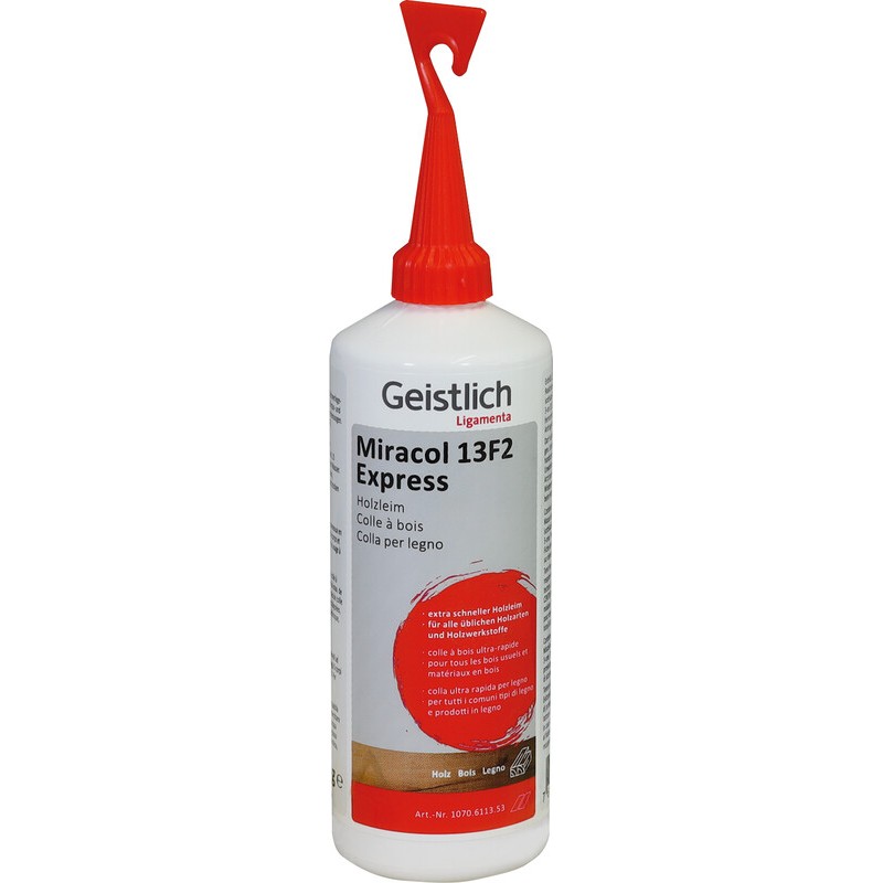 GEISTLICH Holzleim Miracol 13F2 Express weiss, klebt alle üblichen Holzarten, Holzwerkstoffe, Schichtstoff- und Holzverlegeplatten, für Anwendungen im Innenbereich, mit Verstreichspachtel.