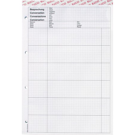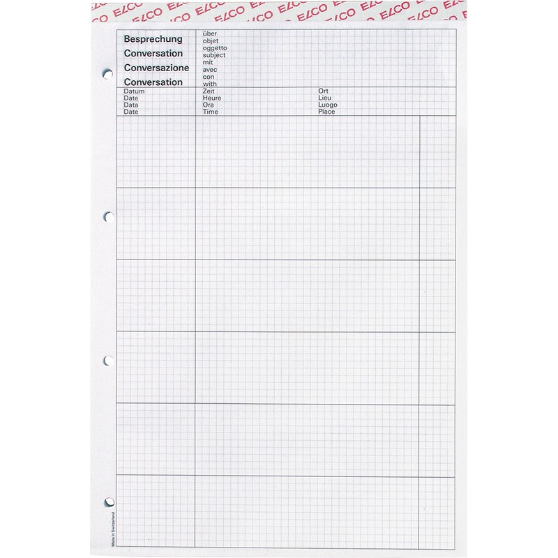 ELCO Besprechungsblock Office Papier weiss, 4 mm kariert, 80 Blatt, perforiert, auf Kartonunterlage, 4 Loch, Vordruck in 4 Sprachen, mit speziellem Vordruck. Nachhaltigkeit eco:plus: Zertifikat: FSC.