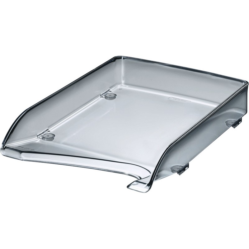 LEITZ® Briefkorb Elegant aus PS, mit versetztem Griffausschnitt, stapelbar, rutschfeste Gummifüsse, hochglänzende Oberfläche, für Format A4. Masse: B 250 x H 63 x T 350 mm.