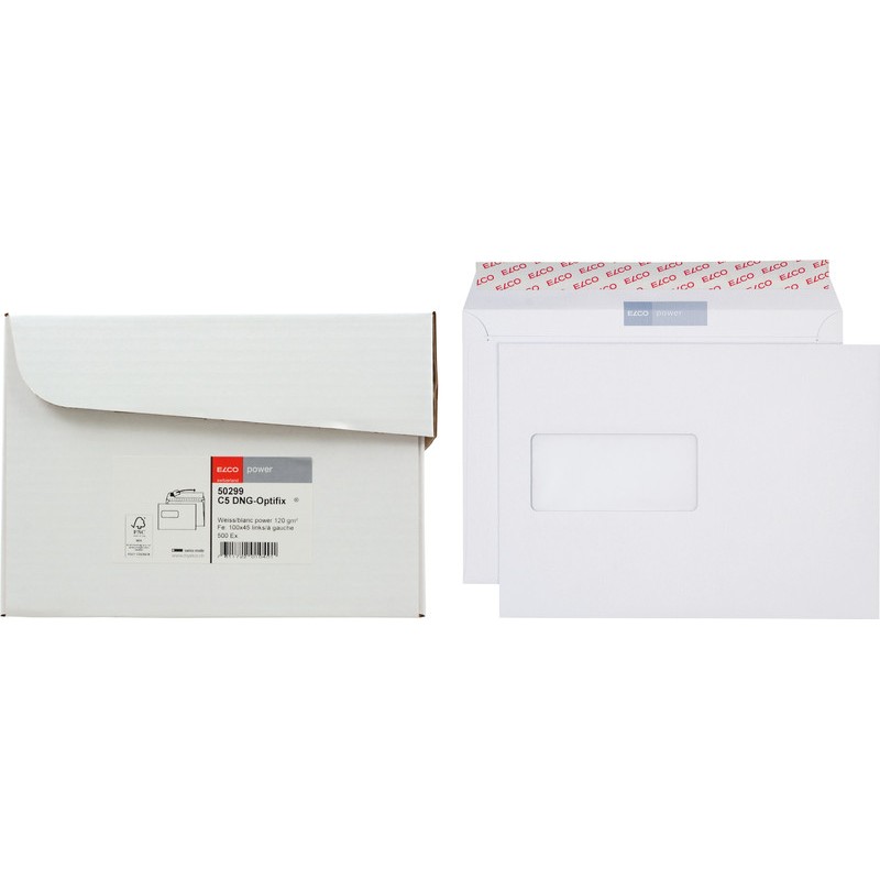 ELCO Briefumschläge Power in Bürogrosspackung unzerreissbar und sicher für den Versand vertraulicher, schwerer, scharfkantiger und hochwertiger Dokumente, weiss, CH-Qualität, elementarchlorfrei, absolute Opazität, beste Bedruckbarkeit, geringes Eigengewicht. Nachhaltigkeit eco:plus: recyclingfähig. Zertifikat: FSC. C5, mit Optifix® Haftklebeverschluss 229 x 162 mm, Façon DNG-HK. Schachtel zu 500 Stück.
