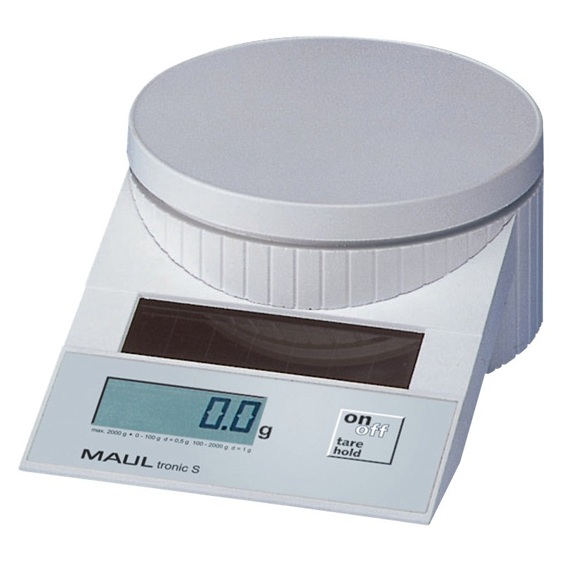 MAUL Briefwaage tronic S aus hochwertigem weissem ABS, eine Taste für alle Funktionen: Ein/Aus/Tara-Funktion, Hold-Funktion zur Speicherung des Anzeigewertes, Solarbetrieb, Abschaltautomatik, automatische Nullstellung. Masse: B 196 x H 65 x T 130 mm, Wiegeteller: Ø 128 mm. Garantie: 3 Jahre. Preis inkl. VRG. Mindestlast 2 g, Skalaeinteilung: 0,5 g bis 100 g, 1 g ab 100 g - 2000 g