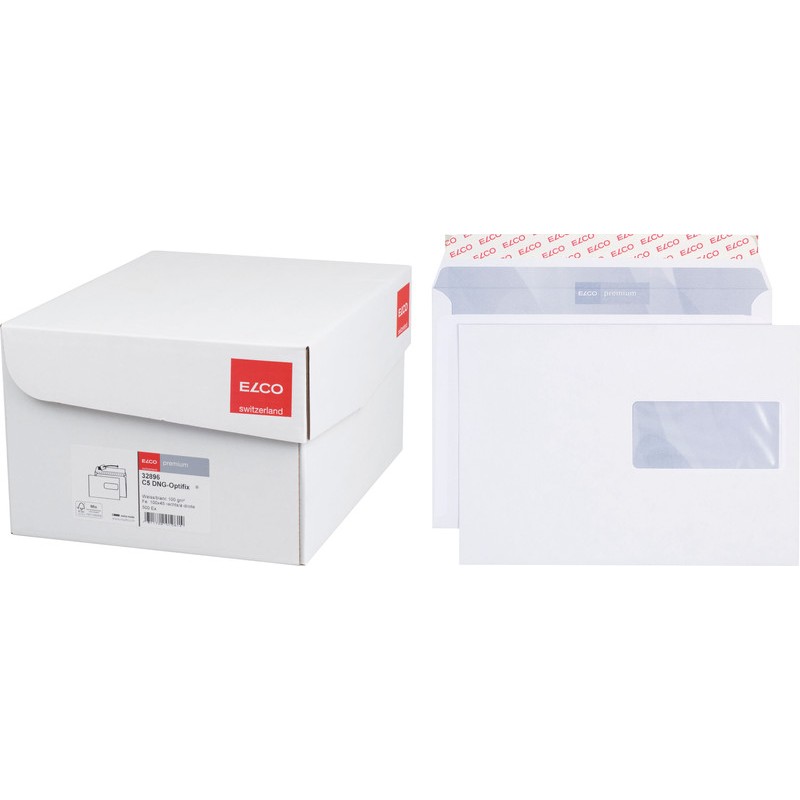 ELCO Briefumschläge Premium in Bürogrosspackung hochweisse Top-Qualität, chlorfrei, grauer Innendruck aus 100% Wasserfarbe. Nachhaltigkeit eco:plus: recyclingfähig. Zertifikat: FSC. C5, mit Optifix® Haftklebeverschluss 229 x 162 mm, Façon DNG-HK. Schachtel zu 500 Stück.
