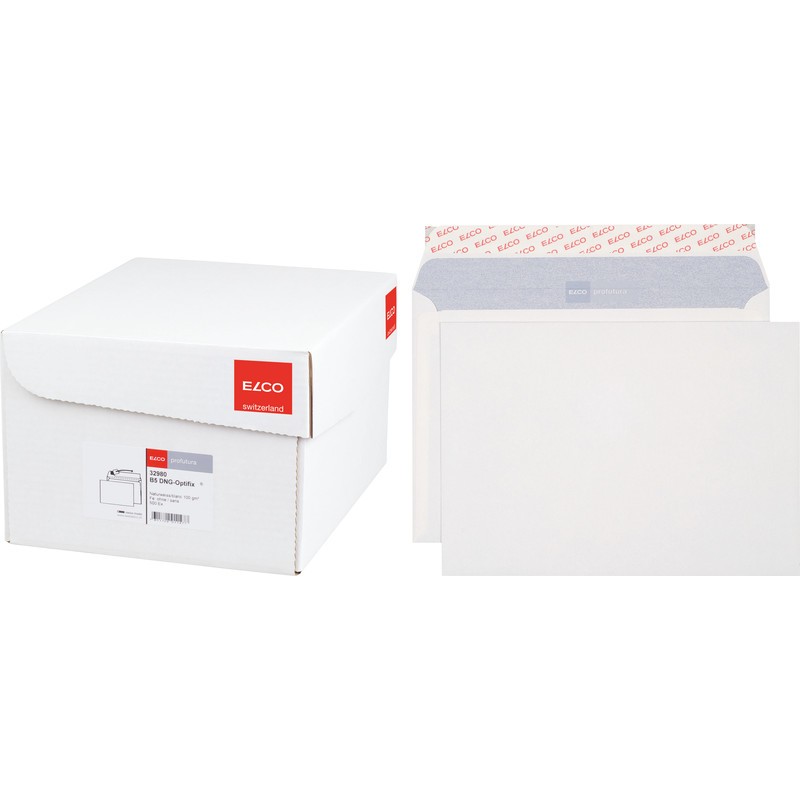 ELCO Briefumschläge Profutura in Bürogrosspackung naturweiss, 100% Recycling. Nachhaltigkeit eco:plus: recyclingfähig. B5, mit Optifix® Haftklebeverschluss. 250 x 176 mm, Façon DNG-HK. Schachtel zu 500 Stück. Zertifikat: Der Blaue Engel.