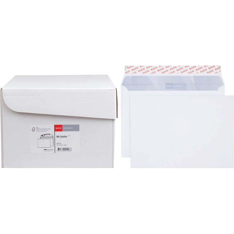 ELCO Briefumschläge Premium in Bürogrosspackung hochweisse Top-Qualität, chlorfrei, grauer Innendruck aus 100% Wasserfarbe. Nachhaltigkeit eco:plus: recyclingfähig. Zertifikat: FSC. B5, mit Optifix® Haftklebeverschluss 250 x 176 mm, Façon DNG-HK. Schachtel zu 500 Stück.