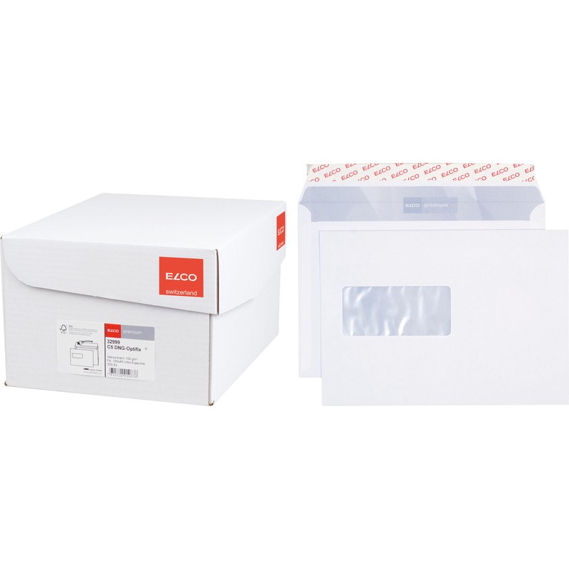 ELCO Briefumschläge Premium in Bürogrosspackung hochweisse Top-Qualität, chlorfrei, grauer Innendruck aus 100% Wasserfarbe. Nachhaltigkeit eco:plus: recyclingfähig. Zertifikat: FSC. C5, mit Optifix® Haftklebeverschluss 229 x 162 mm, Façon DNG-HK. Schachtel zu 500 Stück.