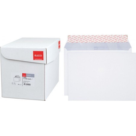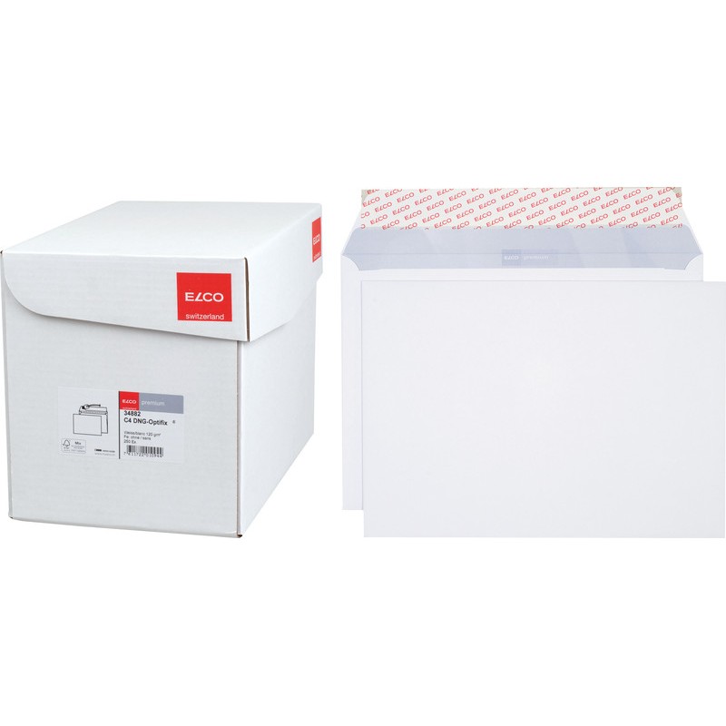 ELCO Briefumschläge Premium in Bürogrosspackung hochweisse Top-Qualität, chlorfrei, grauer Innendruck aus 100% Wasserfarbe. Nachhaltigkeit eco:plus: recyclingfähig. Zertifikat: FSC. C4, mit Optifix® Haftklebeverschluss 324 x 229 mm, Façon DNG-HK. Schachtel zu 250 Stück.