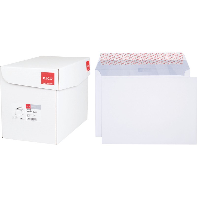 ELCO Briefumschläge Premium in Bürogrosspackung hochweisse Top-Qualität, chlorfrei, grauer Innendruck aus 100% Wasserfarbe. Nachhaltigkeit eco:plus: recyclingfähig. Zertifikat: FSC. B4, mit Optifix® Haftklebeverschluss 353 x 250 mm, Façon DNG-HK. Schachtel zu 250 Stück.