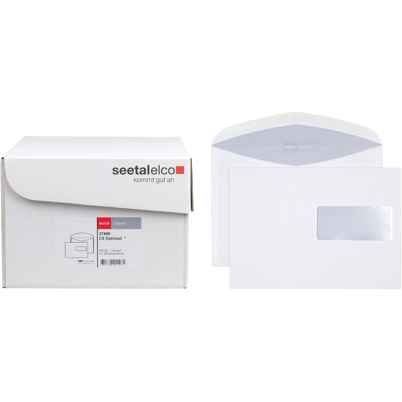 ELCO Briefumschläge classic in Bürogrosspackung weisse CH-Qualität, elementarchlorfrei, grauer Innendruck aus 100% Wasserfarbe. Nachhaltigkeit eco:plus: recyclingfähig. Zertifikat: FSC. C5, mit Optimail® Nassklebeverschluss 229 x 162 mm, Façon DNR. Schachtel zu 500 Stück.