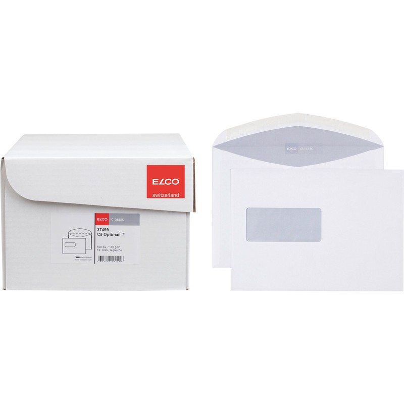 ELCO Briefumschläge classic in Bürogrosspackung weisse CH-Qualität, elementarchlorfrei, grauer Innendruck aus 100% Wasserfarbe. Nachhaltigkeit eco:plus: recyclingfähig. Zertifikat: FSC. C5, mit Optimail® Nassklebeverschluss 229 x 162 mm, Façon DNR. Schachtel zu 500 Stück.