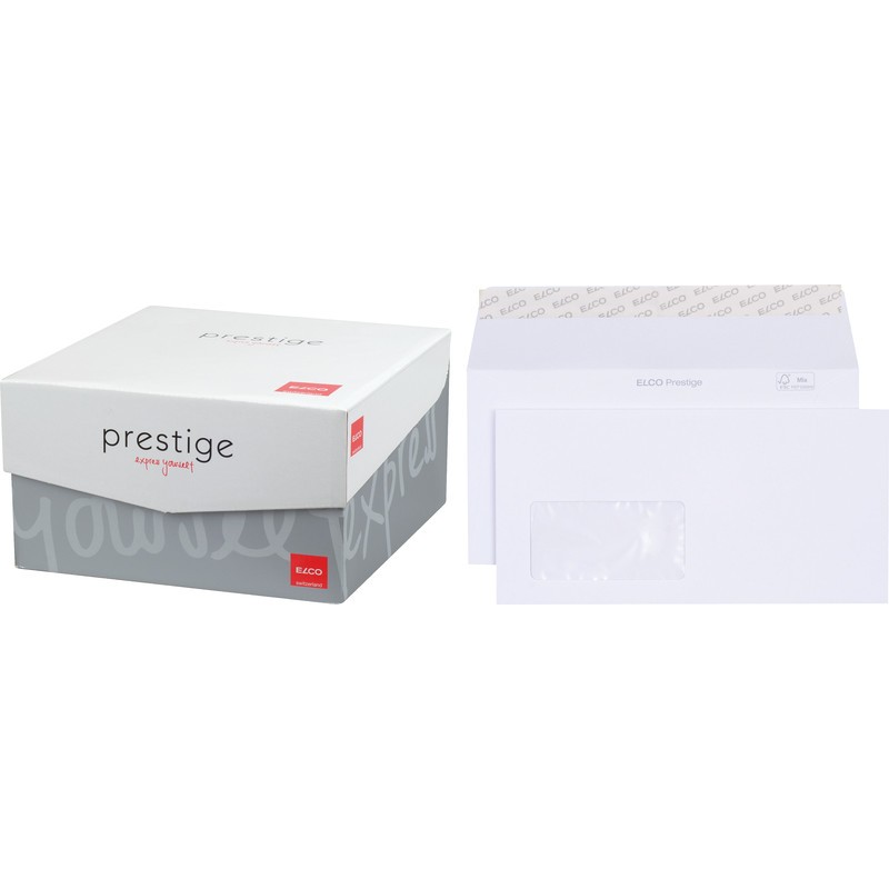 ELCO hochwertige Briefumschläge Prestige in Bürogrosspackung weiss, ohne Innendruck. Nachhaltigkeit eco:plus: recyclingfähig. Zertifikat: FSC. C6/5, mit Optifix® Haftklebeverschluss 229 x 114 mm, Façon DNG-HK. Schachtel zu 250 Stück.