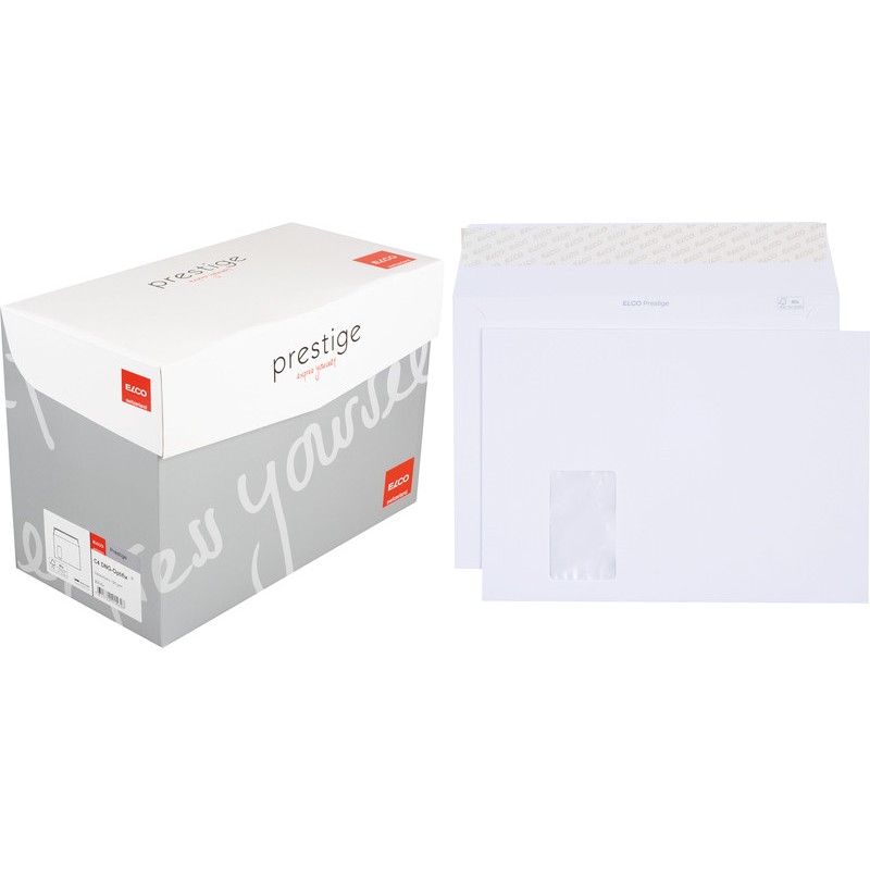 ELCO hochwertige Briefumschläge Prestige in Bürogrosspackung weiss, ohne Innendruck. Nachhaltigkeit eco:plus: recyclingfähig. Zertifikat: FSC. C4, mit Optifix® Haftklebeverschluss 324 x 229 mm, Façon DNG-HK. Schachtel zu 200 Stück.