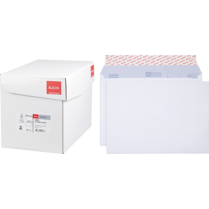 ELCO Briefumschläge Proclima in Bürogrosspackung aus 100% Recyclingmaterial, grauer Innendruck aus 100% Wasserfarbe, hervorragende Opazität, Fenster aus nachwachsenden biologisch abbaubaren Rohstoffen (nach EN 13432). Nachhaltigkeit eco:plus: recyclingfähig. Zertifikat: FSC, Der Blaue Engel. C4, mit Optifix® Haftklebeverschluss 324 x 229 mm, Façon DNG-HK. Schachtel zu 250 Stück.