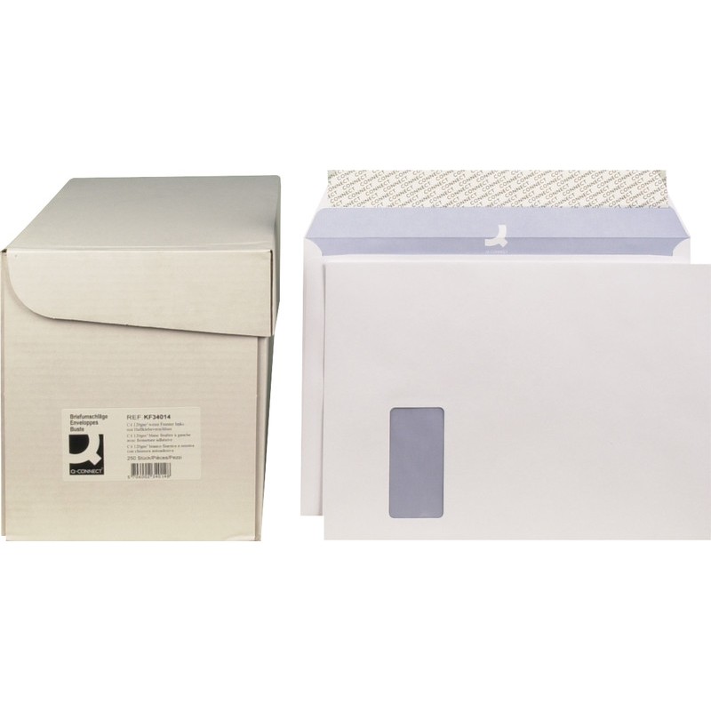 Q-CONNECT® Briefumschläge in Bürogrosspackung weiss, elementarchlorfrei, grauer Innendruck aus 100% Wasserfarbe. C4, mit Haftklebeverschluss 324 x 229 mm, Façon DNG-HK. Schachtel zu 250 Stück.