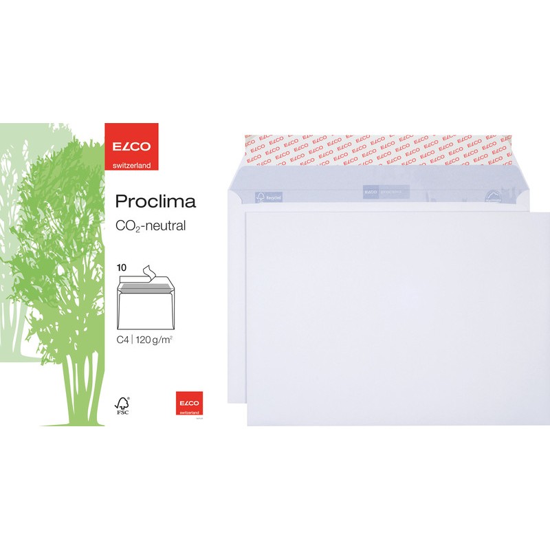 ELCO Briefumschläge Proclima in Kleinpackung 100% Recycling, grauer Innendruck aus 100% Wasserfarbe, hervorragende Opazität. Nachhaltigkeit eco:plus: recyclingfähig. Zertifikat: FSC, Der Blaue Engel. C4, mit Optifix® Haftklebeverschluss 324 x 229 mm, Façon DNG-HK. Cello-Zip zu 10 Stück.