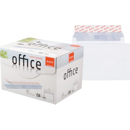 ELCO Briefumschläge Office in Bürokleinpackung hochweisse Top-Qualität, chlorfrei, grauer Innendruck aus 100% Wasserfarbe. Nachhaltigkeit eco:plus: recyclingfähig. Zertifikat: FSC. C6, mit Optifix® Haftklebeverschluss 162 x 114 mm, Façon DNG-HK. Schachtel zu 200 Stück.