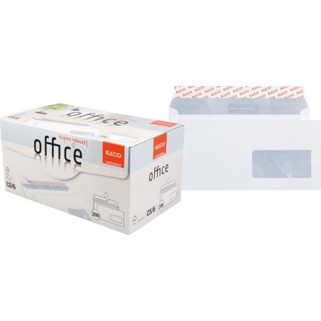 ELCO Briefumschläge Office in Bürokleinpackung hochweisse Top-Qualität, chlorfrei, grauer Innendruck aus 100% Wasserfarbe. Nachhaltigkeit eco:plus: recyclingfähig. Zertifikat: FSC. C6/5, mit Optifix® Haftklebeverschluss 229 x 114 mm, Façon DNG-HK. Schachtel zu 200 Stück.