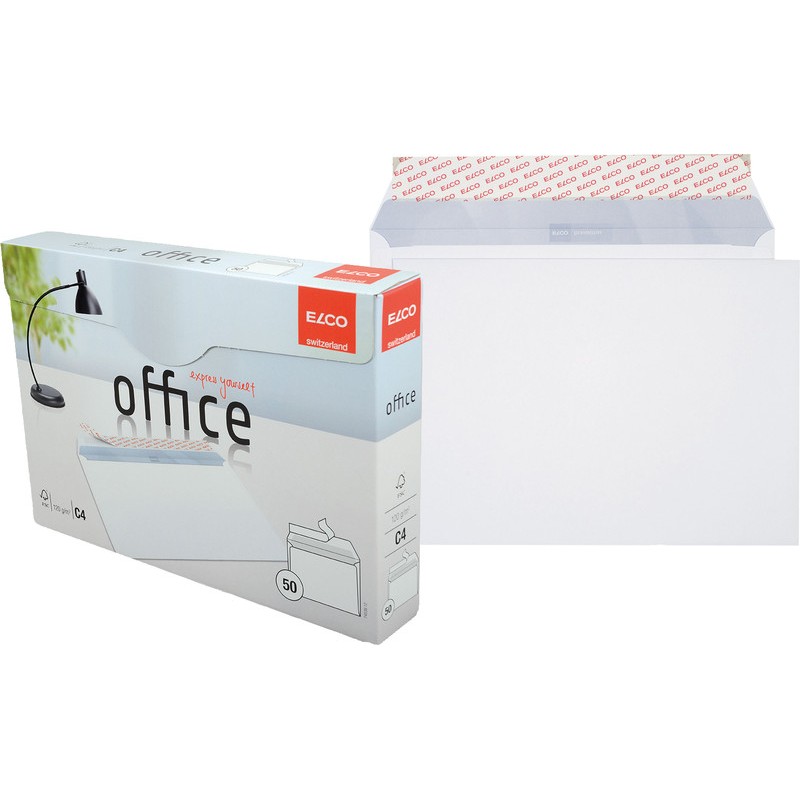 ELCO Briefumschläge Office in Bürokleinpackung hochweisse Top-Qualität, chlorfrei, grauer Innendruck aus 100% Wasserfarbe. Nachhaltigkeit eco:plus: recyclingfähig. Zertifikat: FSC. C4, mit Optifix® Haftklebeverschluss 324 x 229 mm, Façon DNG-HK. Schachtel zu 50 Stück.