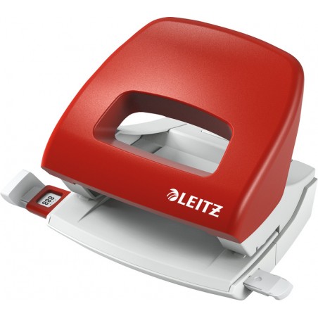 LEITZ® NeXXt Serie kleiner Locher 5038 Unterteil aus Metall, Griff aus ABS mit Metallbügel, für 8 cm Lochabstand, Loch Ø 5,5 mm, Anschlagschiene mit farbiger Bedruckung und Fenster, ultra-scharfe Lochstempel, patentierte Griffmulde für leichtes Lochen, Stanzvermögen 1,6 mm (16 Blatt). Garantie: 10 Jahre. Zertifikat: GS.