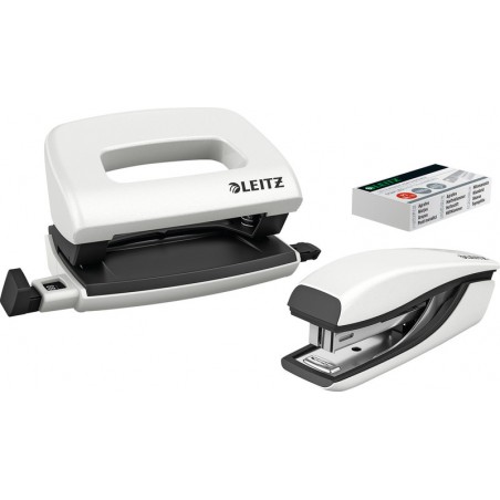 LEITZ® NeXXt Serie Mini-Locher und Mini-Heftgerät Set (Metall) WOW Set bestehend aus kleinem Bürolocher 5060, kleines Heftgerät 5528 und 1 Packung Heftklammern. Locher: Lochabstand 8 cm, mit Anschlagschiene, Stanzvermögen ca. 1 mm (10 Blatt). Heftgerät: Heftkapazität ca. 1 mm (10 Blatt). Passende Heftklammern: Nr. 10. Garantie: 10 Jahre bei Verwendung von LEITZ® Heftklammern. Zertifikat: GS.