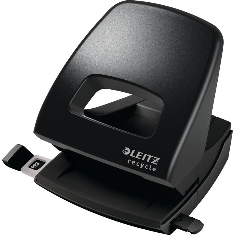 LEITZ® NeXXt Serie Locher Recycle 5003 aus 45% recyceltem Kunststoff (Post-Consumer), Unterteil und Griff aus robustem Metall, für 8 cm Lochabstand, Loch Ø 5,5 mm, Anschlagschiene mit farbiger Bedruckung und Fenster, ultra-scharfe Lochstempel, patentierte Griffmulde für leichtes Lochen, Stanzvermögen 3 mm (30 Blatt). Garantie: 10 Jahre. Nachhaltigkeit eco:plus: zerlegbar konstruiert, recyclingfähig, recycelter Bestandteil, Recycelgehalt Abfall nach Gebrauch max. 10%. Zertifikat: GS.