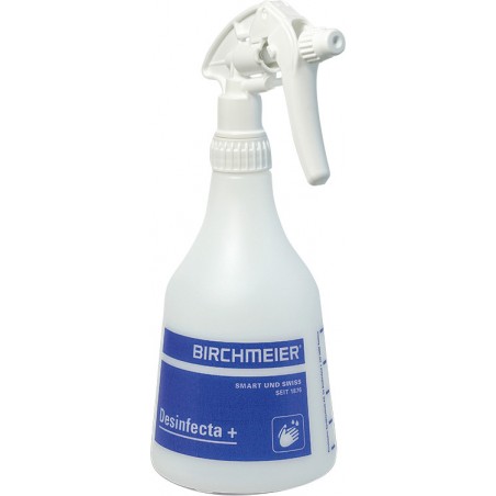 BIRCHMEIER® Sprühflasche Desinfecta+ aus Kunststoff, transparente, bruchsichere, leere Sprühflasche, geeignet für handelsübliche Desinfektionsmittel, Skala in 100 ml Abstufung, spezielles Ansaugsystem, 360° Sprühfunktion (überkopf, schräg, vertikal), verschliessbare Regulierdüse, ergonomischer, robuster Sprühkopf mit langem Handgriff, mehrfach wiederverwendbar, Fassungsvermögen 500 ml. Nachhaltigkeit eco:plus: recyclingfähig, umweltfreundliche Verpackung.