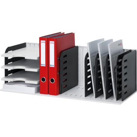 STYRORAC Dokumentenablage aus PS, für die Aufbewahrung von Ordnern, Katalogen, Zeitschriften etc., horizontale und vertikale Ablagefächer, individuelle Einteilung mit Trennwänden und Tablaren, dank vertikalem Feinraster auch für dünne Dokumente sowie für Hängemappen 32 x 24 cm und 32 x 26 cm geeignet, kombinierbar mit STYRODOC Dokumentenablagen trio. Masse Grundeinheit: B 723 x H 248 x T 304 mm. Grundeinheit mit 8 Trennwänden und 3 Tablaren
