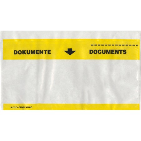 ELCO Quick Vitro Dokumententaschen Dokumente/Documents nicht postkonform, mit Aufreissperforation, Tasche transparent mit gelbem Balken, Text schwarz. Passend für Briefumschläge, Rückseite, Klappe und Anklebeverschluss selbstklebend, aus umweltverträglichem PE, frei von Gefahrenstoffen. Schachtel zu 250 Stück.