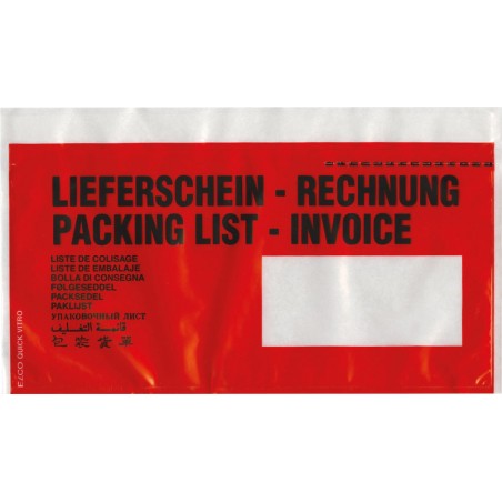 ELCO Quick Vitro Dokumententaschen Lieferschein/Rechnung nicht postkonform, mit Aufreissperforation, Tasche rot mit ausgespartem Fenster, Text schwarz in 9 Sprachen (deutsch/englisch/niederländisch/französisch/spanisch/portugiesisch/russisc h/arabisch/chinesisch). Passend für Briefumschläge, Rückseite, Klappe und Anklebeverschluss selbstklebend, aus umweltverträglichem PE, frei von Gefahrenstoffen. Schachtel zu 250 Stück.