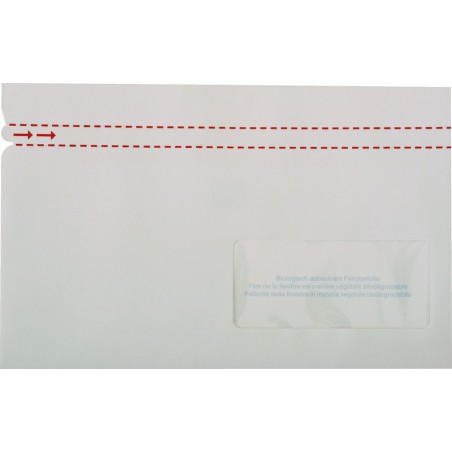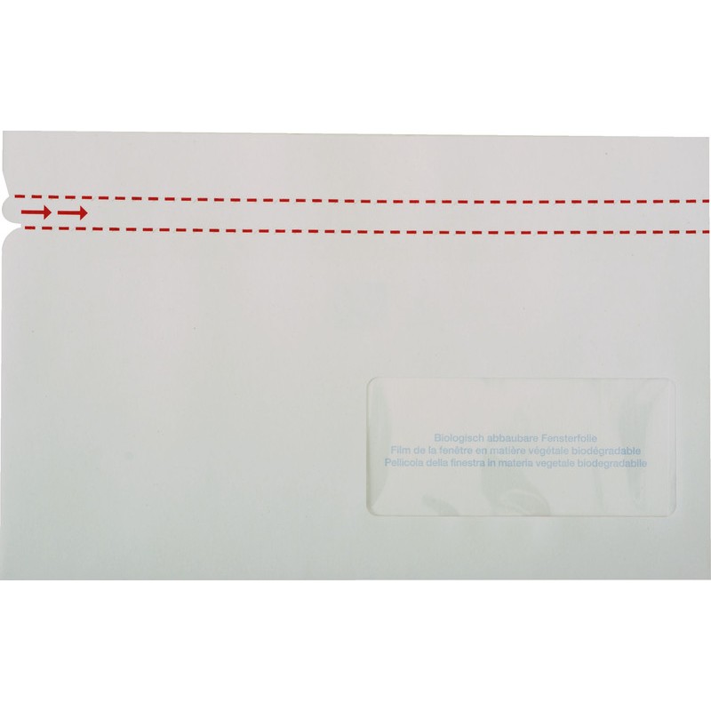 ELCO Quick Vitro Papier ohne Druck postkonform, aus Kraftpapier, 110 g/m2, mit Aufreissperforation, Tasche weiss, opak, mit ausgespartem Fenster, biologisch abbaubare Fensterfolie, passend für Briefumschläge, Rückseite, Klappe und Anklebeverschluss selbstklebend. Schachtel zu 250 Stück. Nachhaltigkeit eco:plus: recyclingfähig. Zertifikat: FSC.