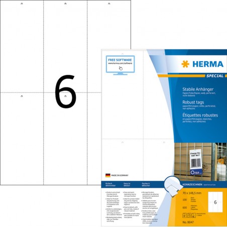 HERMA Special Anhänger weisse, nicht klebende Etiketten auf Blättern DIN A4, besonders robust durch Papier/Folie/Papier-Verbund 166 g/m2, Mikroperforation, beste Druckergebnisse, ideal für Produkt- und Preisauszeichnung von Textilien, mit vorgestanzter Lochung, einfache Befestigung mit Etikettierpistolen oder Fäden und Splinte. Geeignet für Kopierer, Laser-/Inkjetdrucker und Farblaserdrucker/-kopierer. Packung zu 100 Blatt.