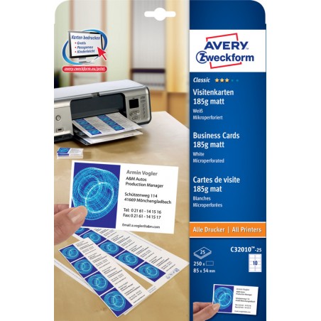 AVERY® ZWECKFORM Visitenkarten, matt l auf Bogen DIN A4 mit 10 Visitenkarten Format 85 x 54 mm, spezialbeschichtet, weiss, beidseitig bedruckbar, mikroperforiert. Geeignet für Kopierer, Laser-/Inkjetdrucker und Farblaserdrucker/-kopierer. Nachhaltigkeit eco:plus: Zertifikat: FSC.