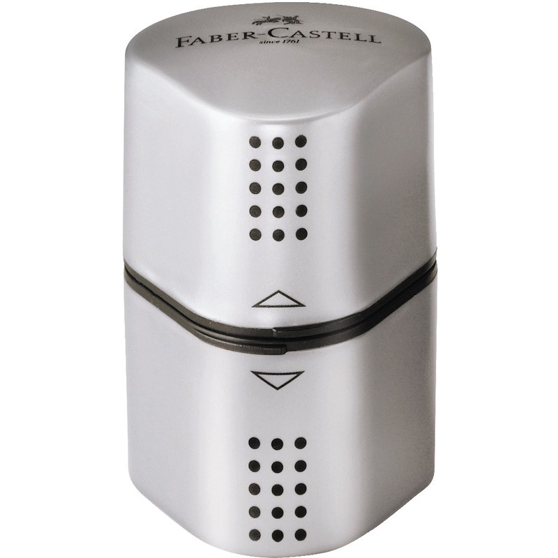 FABER-CASTELL Spitzer Grip 2001 aus PP, eine Seite mit Doppelspitzer Ø 8 + 10 mm, andere Seite mit Einfachspitzer, für Blei- und Farbstifte, Standard und Jumbo, für alle gängigen Stiftformen, mit Behälter auf beiden Seiten, Dreikantform, 65 mm hoch.