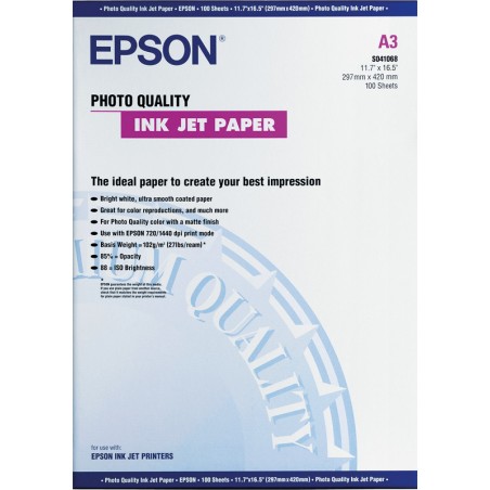 EPSON® Inkjet Fotopapier bis zu 1440 dpi verwendbar, für schwarze und farbige Ausdrucke, leicht matte Oberfläche. Geeignet für Epson Stylus Drucker. Packung zu 100 Blatt.