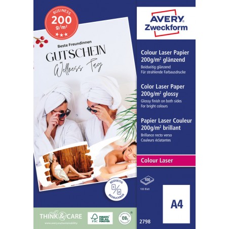 AVERY® ZWECKFORM Fotopapier Colour Laser Superior beidseitig beschichtet, hochglänzend, weiss, für fotorealistische Ausdrucke mit bester Tonerhaftung. Geeignet für Laser- und Farblaserdrucker. Schachtel zu 100 Blatt. Nachhaltigkeit eco:plus: Zertifikat: FSC.
