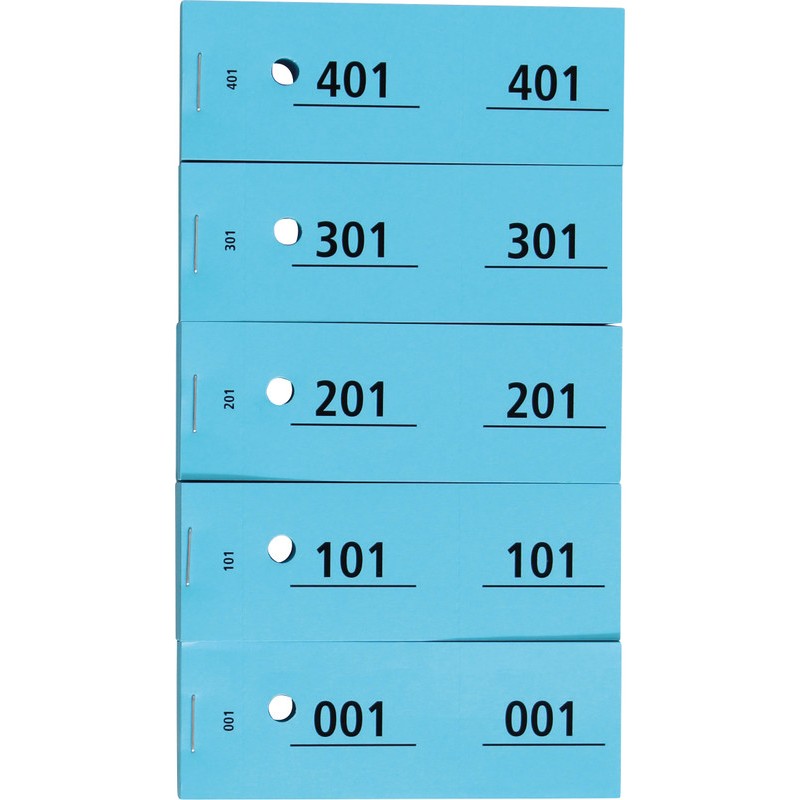 Garderobenblöcke 1 - 500 fortlaufende Doppel-Nummeration in Schwarz, 2 Perforationen für einfaches Abreissen, gelocht, geheftet, Format: 113 x 40 mm. Block zu 100 Blatt. Packung zu 5 Blöcke von 1 - 500 nummeriert. Nachhaltigkeit eco:plus: kompostierbar, abbaubar, zerlegbar konstruiert, recyclingfähig, Recycelgehalt Abfall nach Gebrauch max. 100%, Abfallminderung.