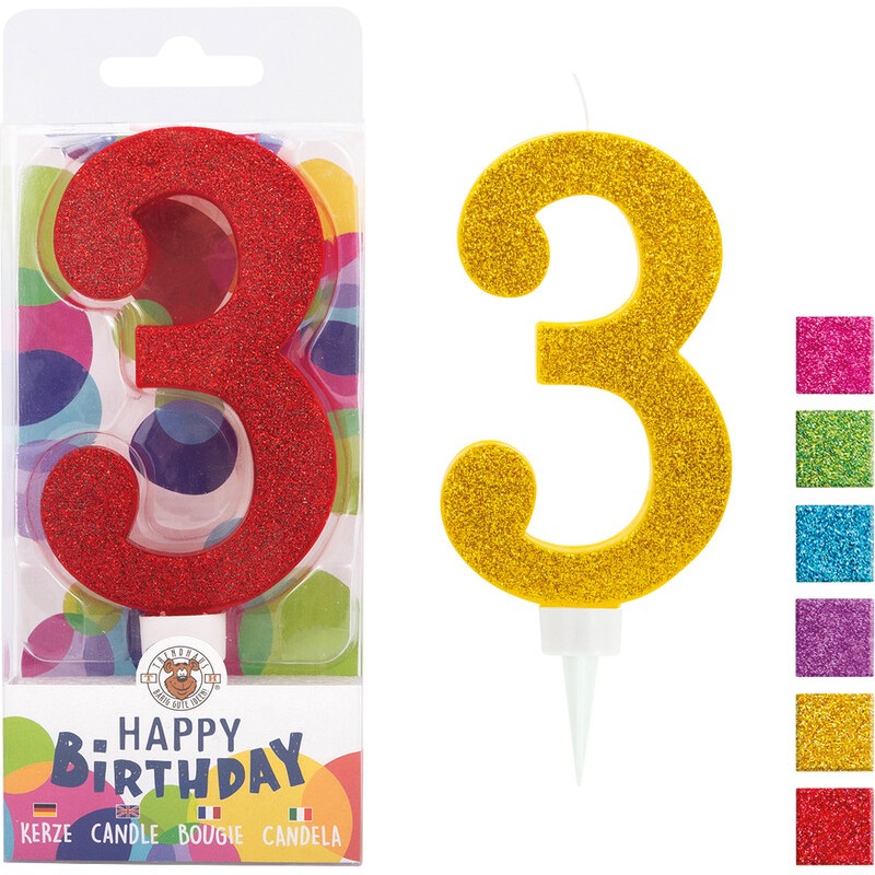 TRENDHAUS® Zahlenkerzen Birthday Fun Glitter Maxi mit Glitter. Masse: B 70 x H 170 x T 27 mm. farbig sortiert, rot, gold, lila, blau, grün, pink und silber
