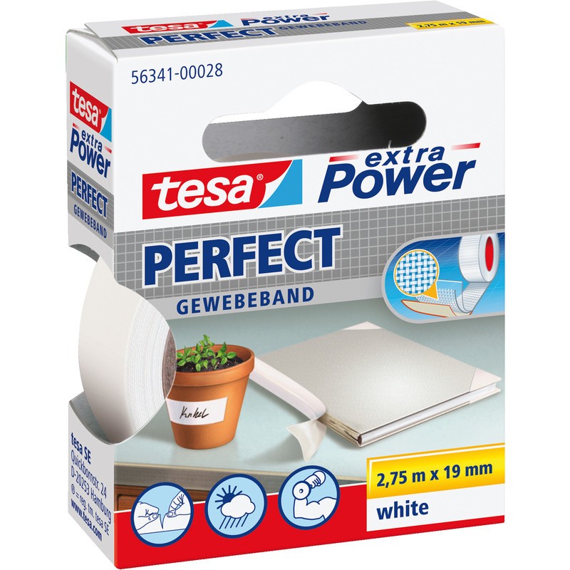 TESA® Gewebeband extra Power Perfect aus Zellwollgewebe mit Kunststoffbeschichtung, selbstklebend, zum Basteln, Reparieren, Befestigen, Bündeln, Verstärken, Kennzeichnen etc., für saubere, perfekte und professionelle Ergebnisse, hohe Wetterfestigkeit, für Innen- und Aussenanwendungen, reissfest, aber von Hand einreissbar, beschriftbar. 19 mm x 2,75 m