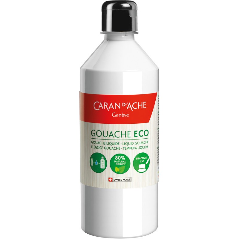 CARAN D'ACHE Gouache flüssig Eco lichtechte Farbe aus 80% natürlichen Inhaltsstoffen (ausser Neonfarben), wasserlöslich, hohe Deckkraft auch bei fünffacher Verdünnung mit Wasser, Dosierkopf für exaktes, sparsames Dosieren, haftet auf Papier, Karton, Holz, Glas, Metall, Salzteig etc., mit Seifenwasser von Händen, Böden und Tischen entfernbar, Flasche aus PET ohne BPA und Phthalate. Flasche zu 500 ml. Nachhaltigkeit eco:plus: umweltfreundliche Verpackung.