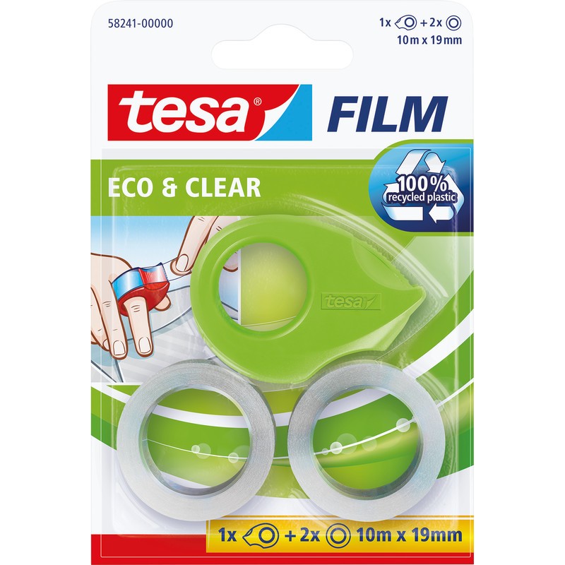 TESA® Mini-Abroller Film eco & clear ecoLogo® Rolle und Rollenkern aus 100% recyceltem Kunststoff, grün, Abroller handlich und flexibel, für 10 m Bandlänge, Rollenbreite bis 19 mm, lösungsmittelfrei, inkl. 2 Rollen eco & clear 19 mm x 10 m. Nachhaltigkeit eco:plus: zerlegbar konstruiert, verlängertes Produktleben, recycelter Bestandteil, umweltfreundliche Verpackung.