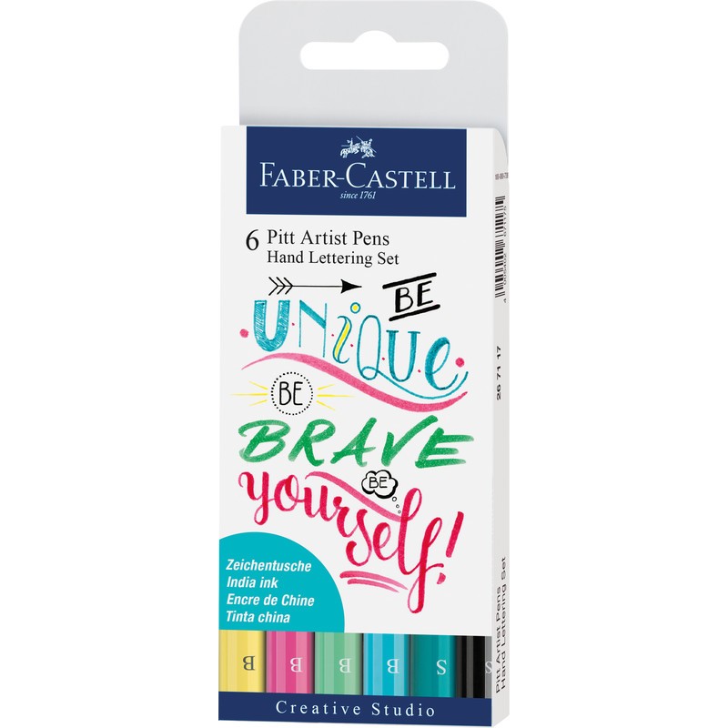 FABER-CASTELL Tuschestifte Pitt Artist Pen Lettering Pastelltöne geeignet für Skizzen, Zeichnungen, Layouts, Modezeichnungen und Illustrationen, hohe Deckkraft und Lichtbeständigkeit, geruchsneutral, säurefrei, pH-neutral, wasserfest, schlägt nicht durchs Papier, pigmentierte Zeichentusche. Etui zu Tuschestifte schwarz und kobaltgrün Strichbreite 0,3 mm und Tuschestifte Pinselspitze lichtgelb lasierend, krapplack rosa, kobalttürkis hell und phthalogrün hell.