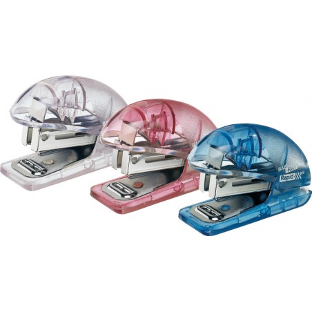 RAPID® Heftgerät Baby-Ray F4 aus Kunststoff, mit Oberlademechanik, farbig sortiert transparent, rosa und blau, mit integriertem Heftklammernentferner, Heftkapazität ca. 1 mm (10 Blatt), Ausladung 50 mm. Passende Heftklammern: R26/6 mm. Garantie: 5 Jahre bei Verwendung von RAPID® Heftklammern.