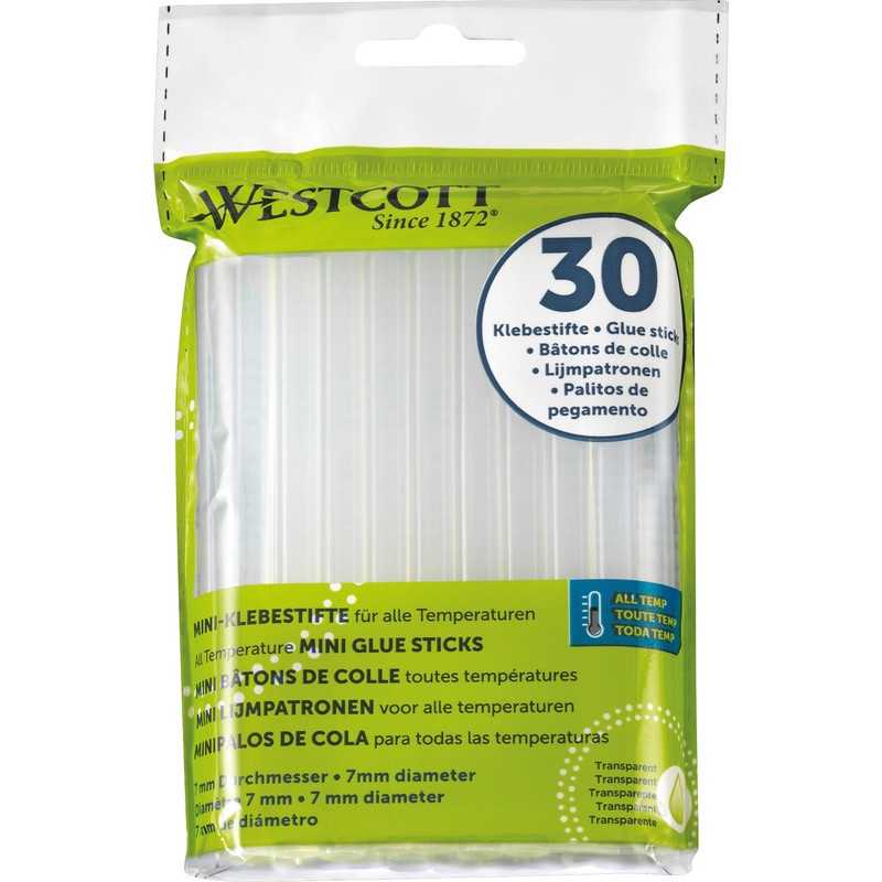 WESTCOTT® Heissklebestifte zu Heissklebepistole Mini für alle Temperaturen. Masse: Länge 102 x Ø 7 mm. Packung zu 30 Stück.