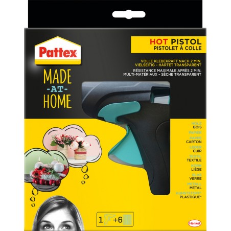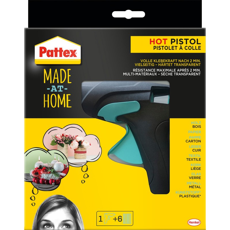 PATTEX® Heissklebepistole Made at Home mit mechanischem Vorschub und elektronischer Temperatursteuerung, zum universellen Heisskleben von vielen Materialien, trocknet transparent, ideal zum Fixieren, Montieren, Dekorieren und Basteln, genaue und sichere Anwendung, Aufschmelztemperatur 130°C, kein Nachtropfen, Klebungen fest und belastbar schon nach 2 Min., Leistung 70 W, inkl. 6 Klebepatronen. Preis inkl. VRG.
